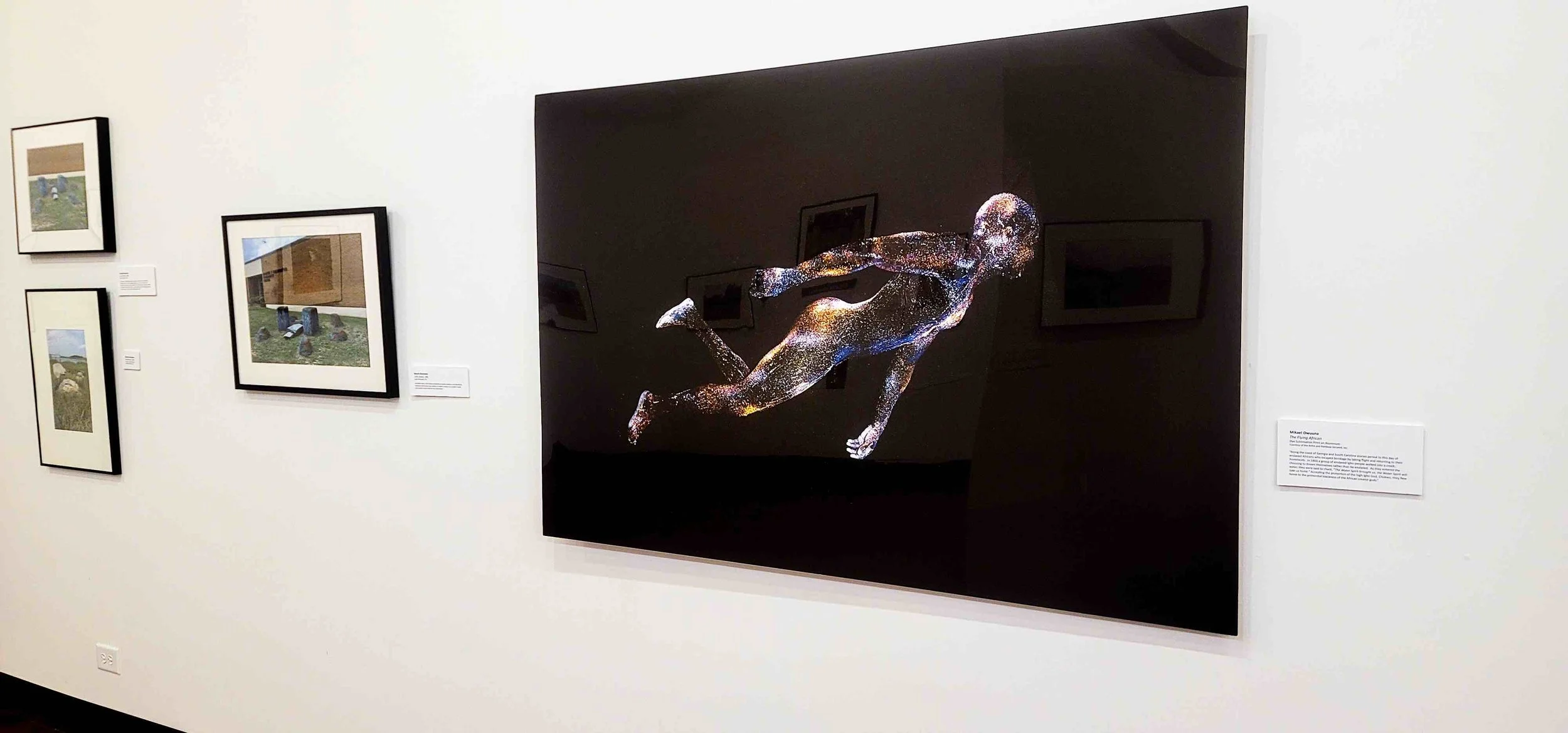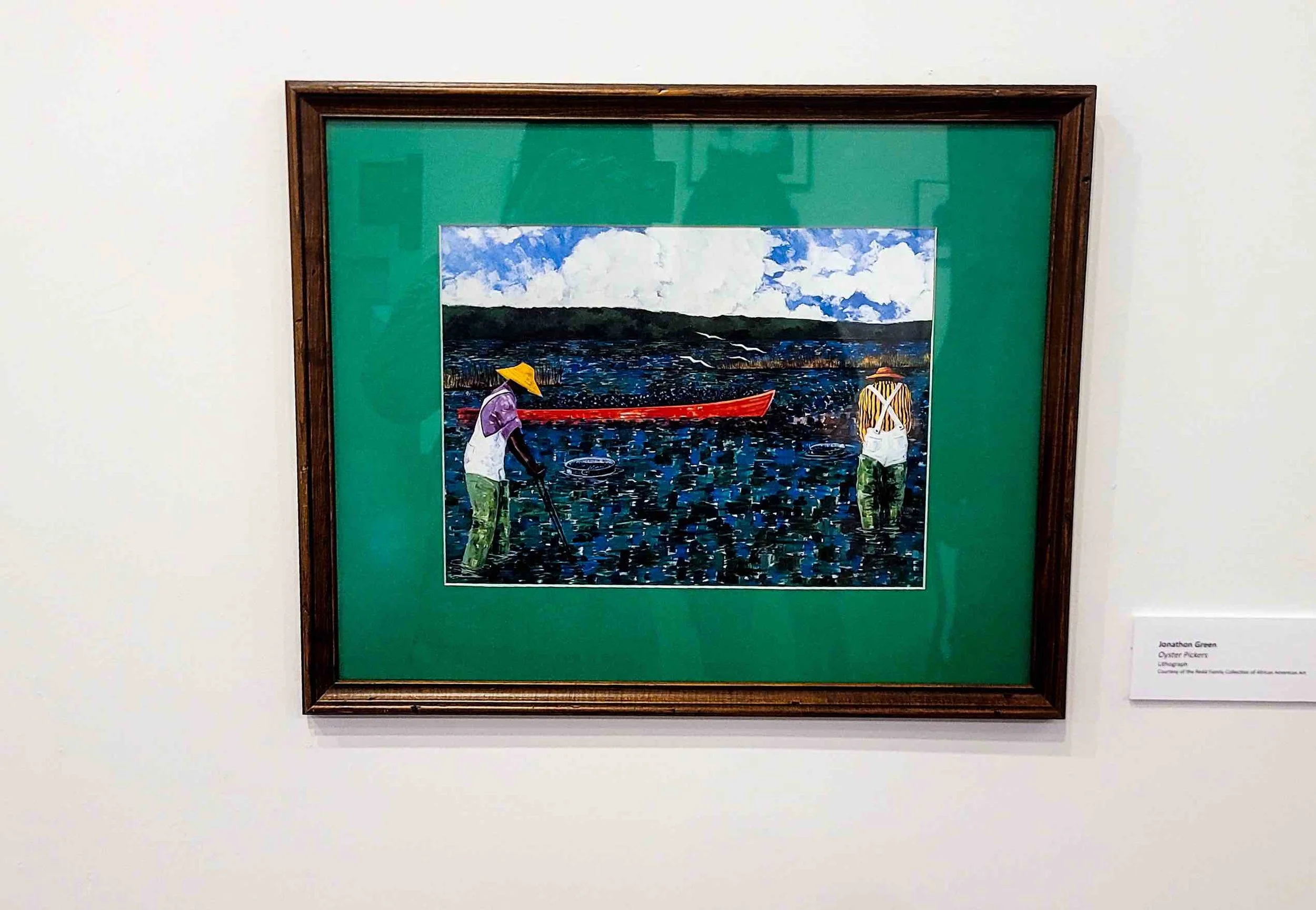 The exhibition features The Flying African from Mikael Owunna’s Infinite Essence series, a tribute to enslaved Africans who, according to legend, escaped captivity by taking flight—returning symbolically to their homeland and the primordial blackness from which all life emerged. Also on view are three works from The Redd Family Collection of Black Art by the Black queer artist Johnathan Green: Oyster Pickers, Yemassee Choir, and Fishing on the Trail.